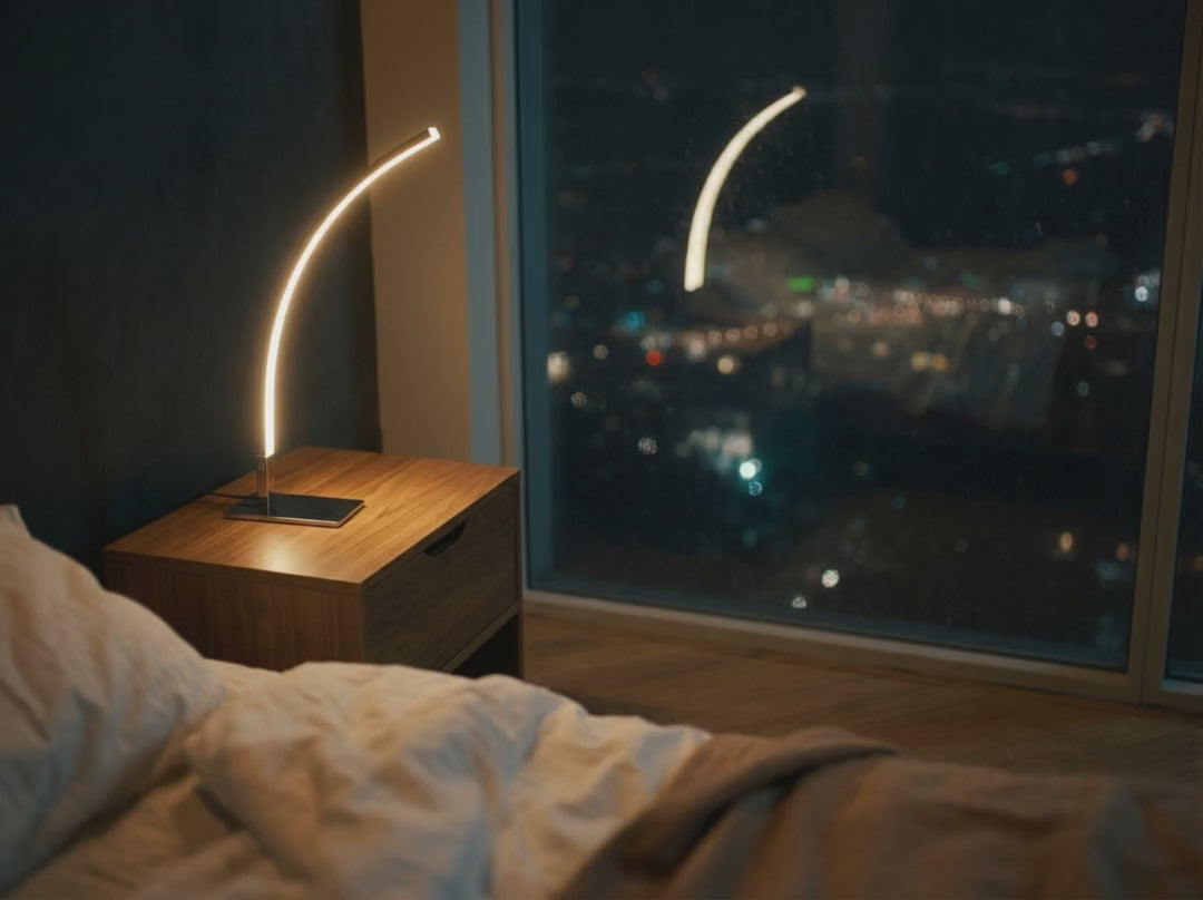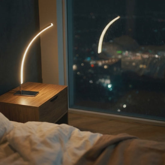 A single arc of chrome light, drawn through your room like a breath held and released. The Crescent sits quiet on a desk or nightstand, casting a warm neutral glow that softens everything around it, the kind of light that makes 11pm feel like permission to slow down.