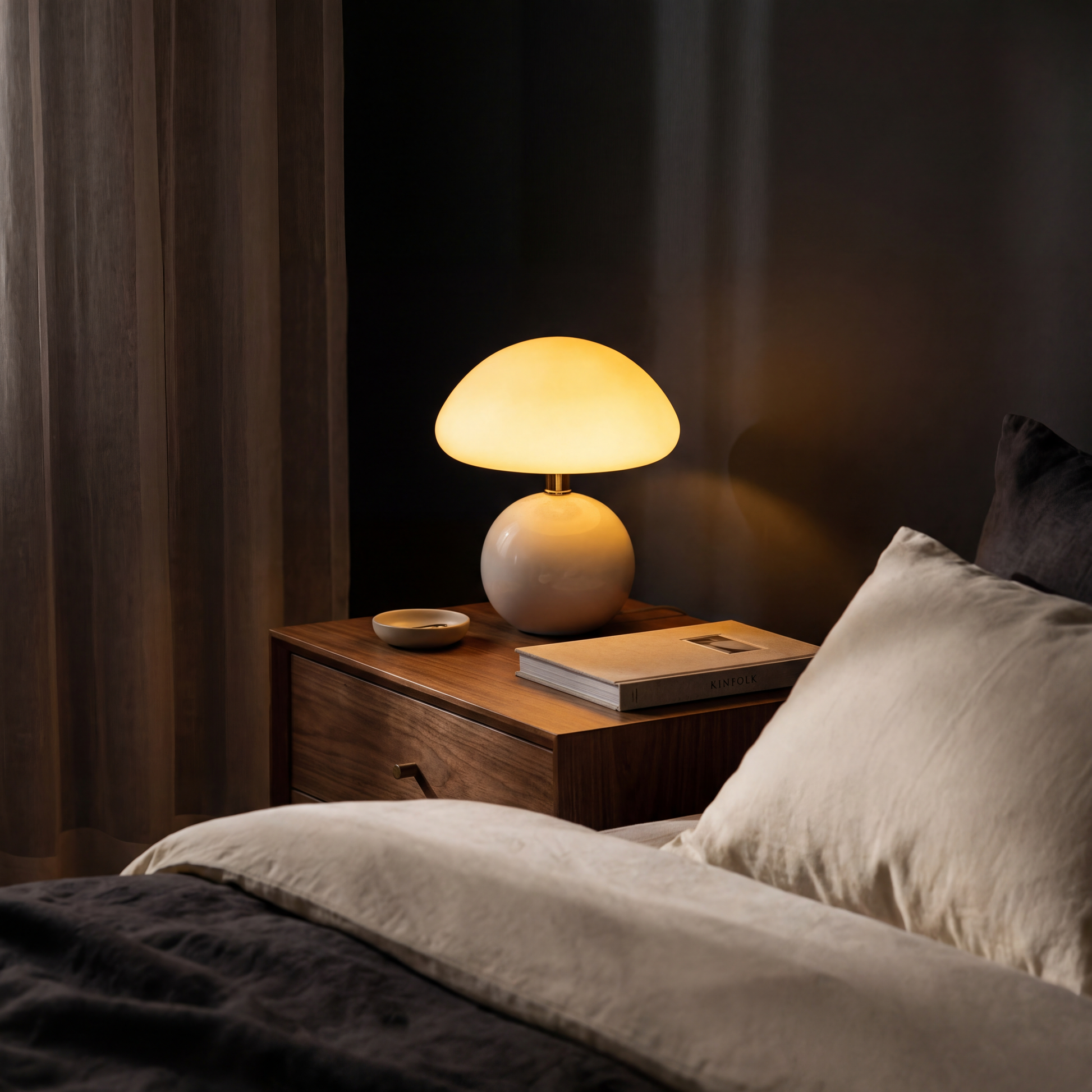 The Dusklight Mushroom Lamp brings a warm, diffused glow to any space through its frosted dome shade and glossy ceramic sphere base. Three color temperature settings let you shift the mood from bright and focused to dim and golden - adapting to every hour of the evening.