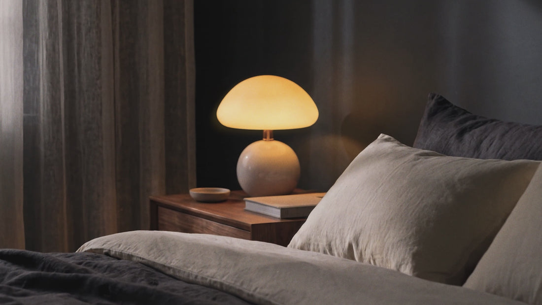 Soft light. Sculptural form. The kind of lamp that changes a room just by being in it. The Dusklight Mushroom Lamp brings a warm, diffused glow through its frosted dome shade and glossy ceramic sphere base. Three color temperature settings let you shift the mood from bright and focused to dim and golden — adapting to every hour of the evening.